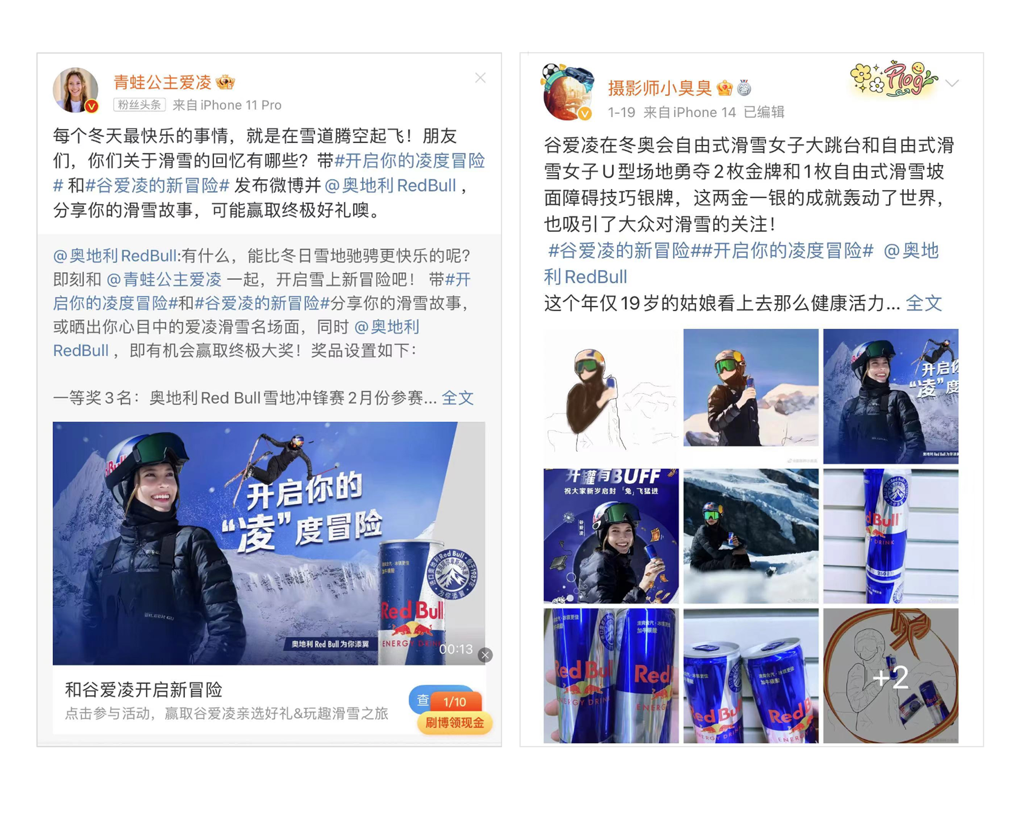 1. 随着近年来滑雪运动的日益普及与热度的增加,奥地利Red Bull品牌携手谷爱凌发布活动吸引冬季运动爱好者。