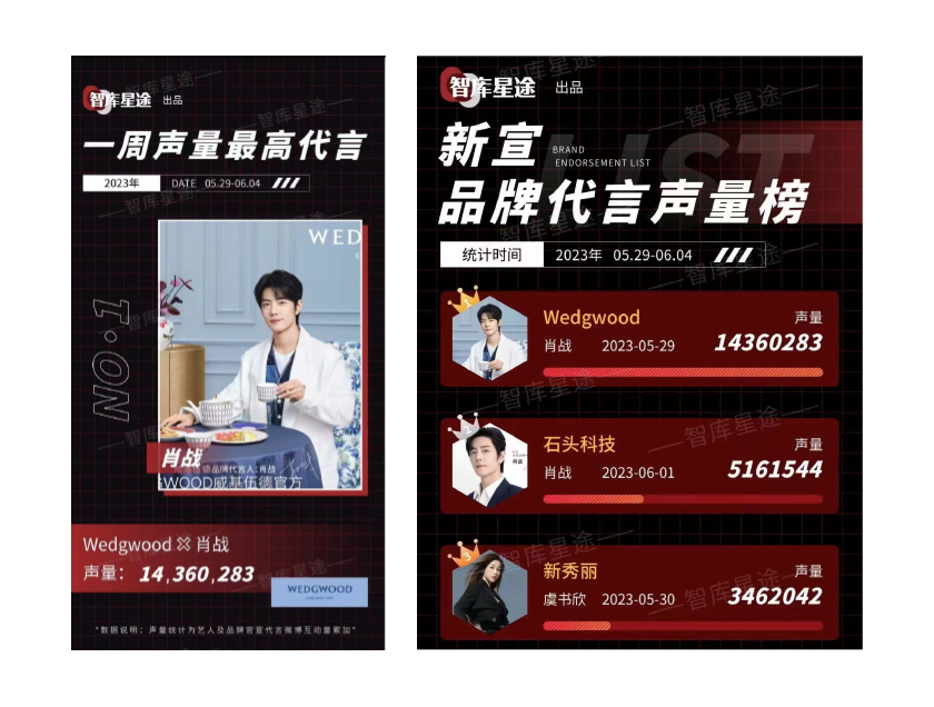 WEDGWOOD是菲时卡旗下的一个英国皇家御用骨瓷品牌,2023年5月,WEDGWOOD与肖战合作,宣布肖战为品牌代言人。并同步在微博、微信、小红书等平台发起“传承百年匠心,绽放优雅「瓷」刻”主题的活动,吸引粉丝及消费者的关注和参与,引爆线上流量。